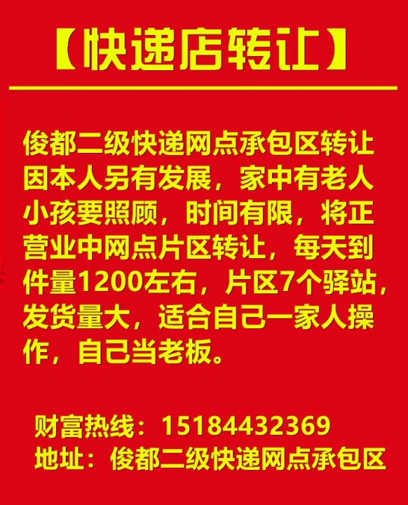 【快递店转让】俊都二级快递网点承包区转让因本人另有发展,家中有老人小孩...